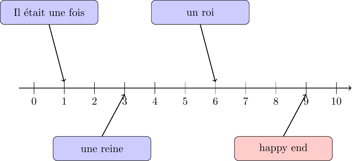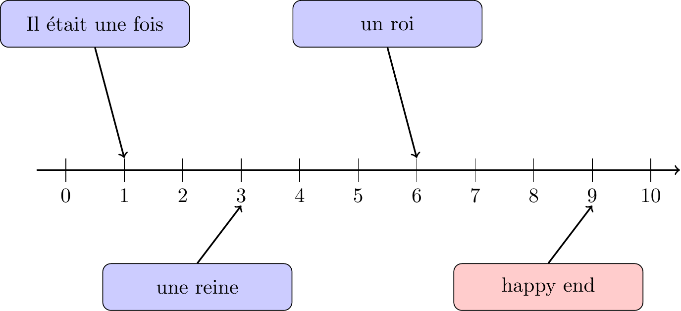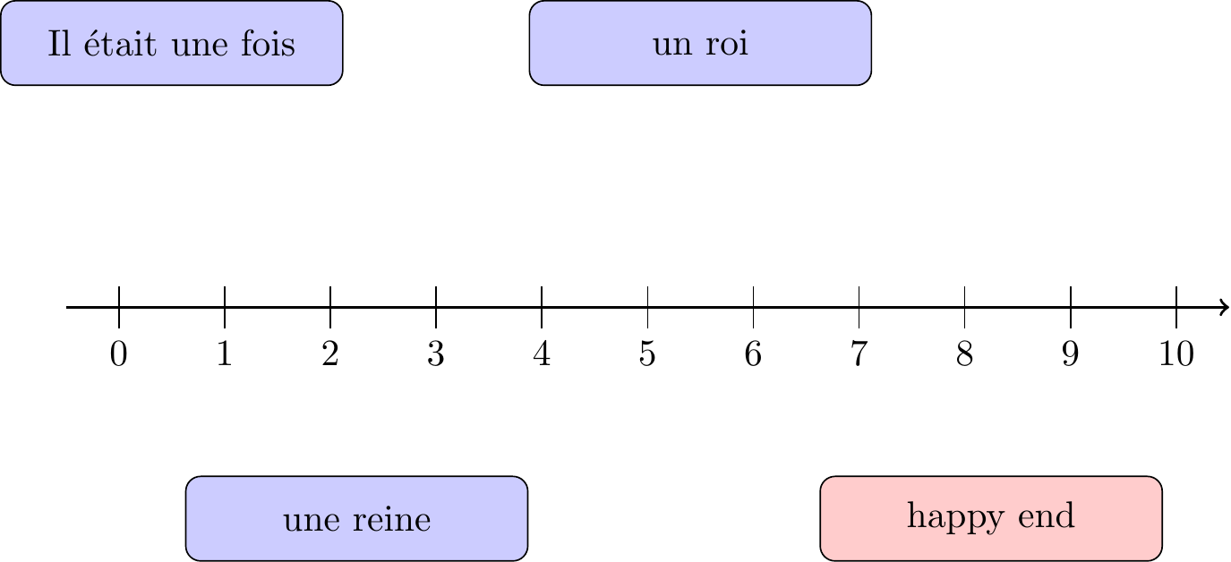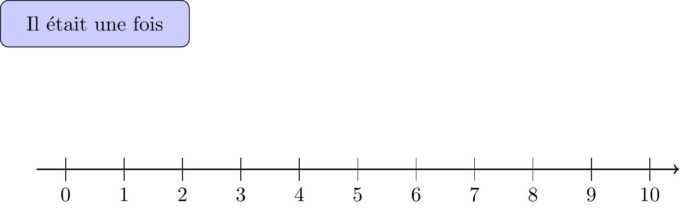] (fois) at (0.5, 2.5) {Il était une fois};- La commande