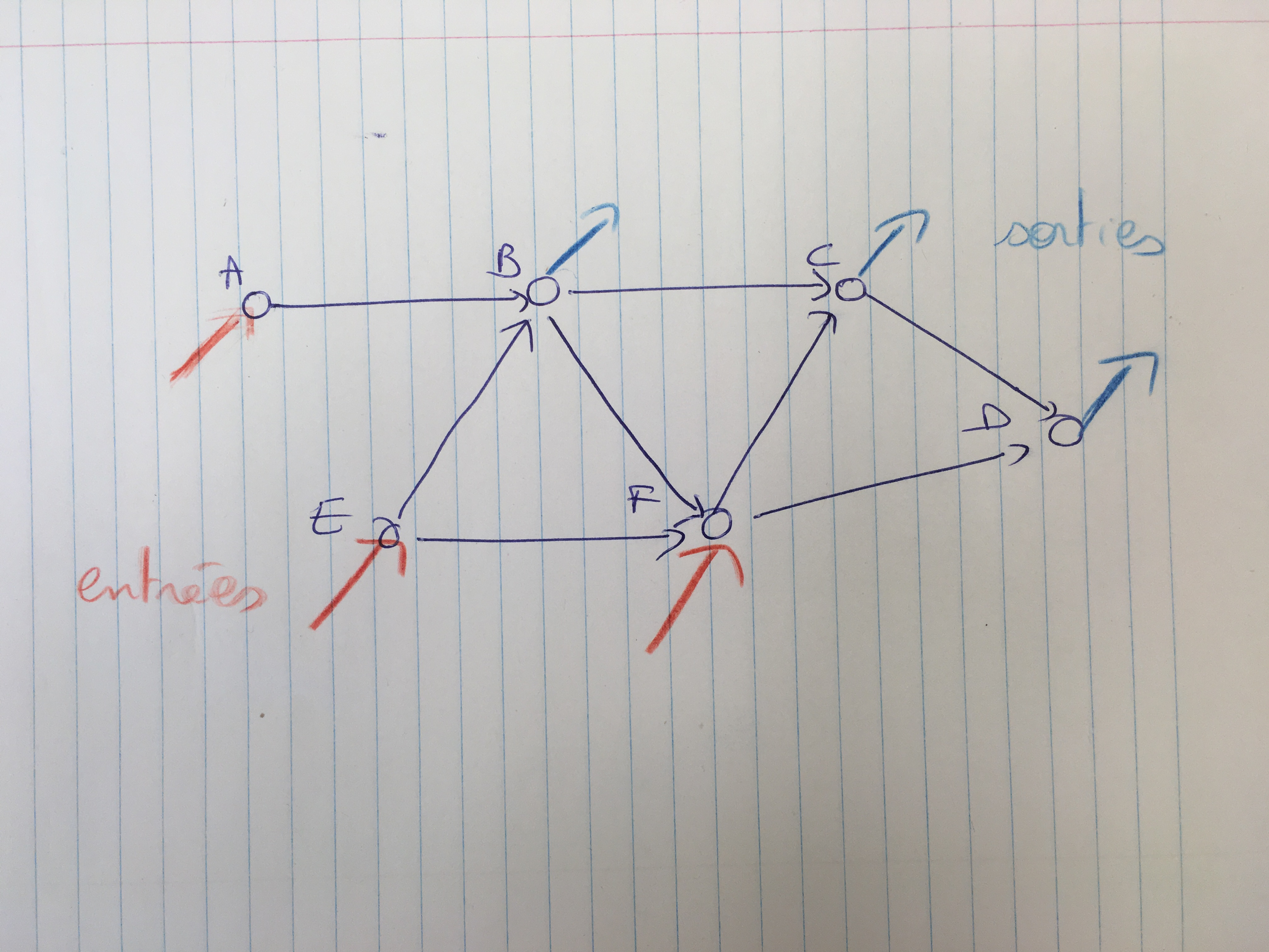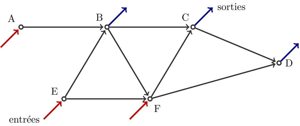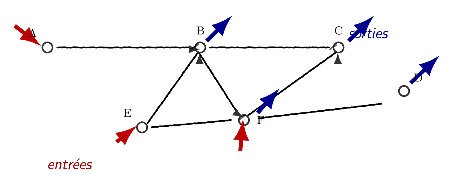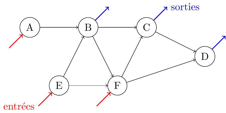 \draw[thick, ->, blue] (D) -- ++ (45:1);\draw[thick, <-, red] (A) -- ++ (225:1);: Cette ligne dessine une flèche rouge épaisse pointant vers le nœud A, indiquant une entrée.++est utilisé pour faire une translation relative à la position actuelle du nœud A et(225:1)spécifie la direction (225 degrés) et la distance (1 unité) de la flèche. Les deux autres lignes similaires font de même pour les nœuds E et F, avec une étiquette “entrées” ajoutée à côté de la flèche pointant vers E.\draw[thick, ->, blue] (B) -- ++ (45:1);: Cette ligne dessine une flèche bleue épaisse partant du nœud B, indiquant une sortie. De même,++ (45:1)spécifie la direction (45 degrés) et la distance (1 unité) de la flèche. Les deux autres lignes similaires font de même pour les nœuds C et D, avec une étiquette “sorties” ajoutée à côté de la flèche partant de C.