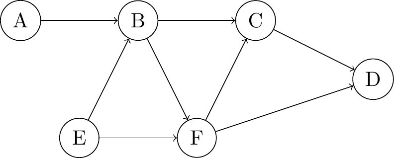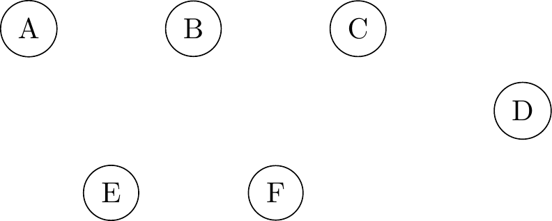 \node [circle, draw] (F) at (3, -2) {F};Ce code place des nœuds simples en cercles à des positions fixes. Le résultat du code est le suivant :